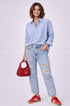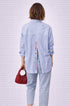 A classic shirt with a playful twist. This blue and white striped shirt features a timeless button-down front, balanced by a statement open-back detail that sets it apart. Finished with a vertical embroidered slogan reading “Love Me, Love You” in bold red lettering, it adds personality and charm from every angle.