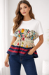 This top blends casual comfort with a statement, fashion-forward design. Crafted from a soft, breathable white fabric, it features a classic crew neckline and short sleeves for an easy, everyday fit. What sets it apart is the eye-catching layered peplum detail across the front—adorned with vibrant floral prints and contrasting striped accents—that adds texture, color, and a playful silhouette.