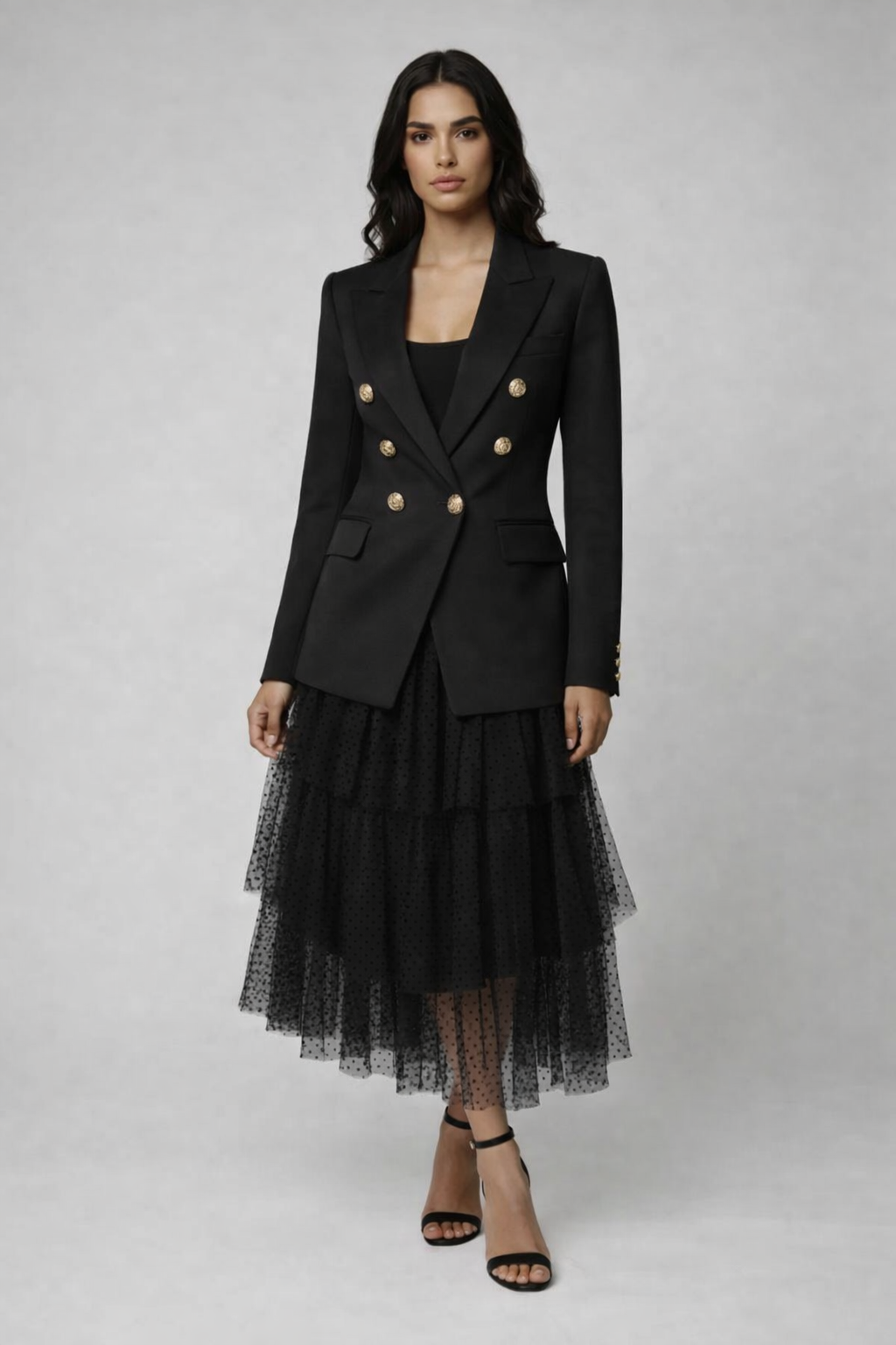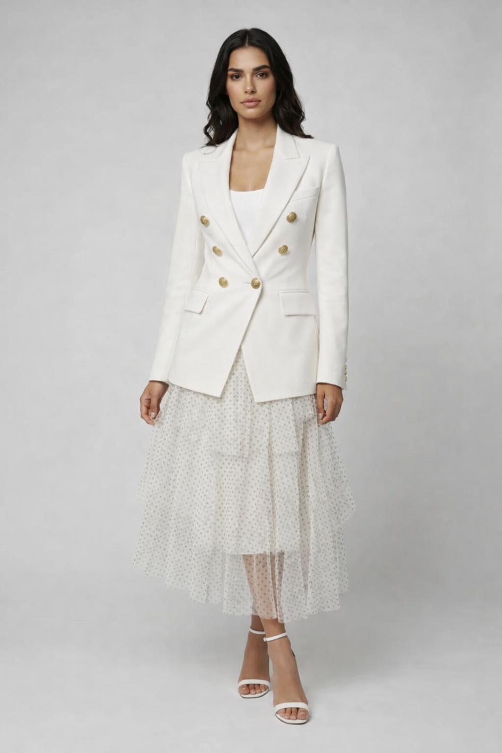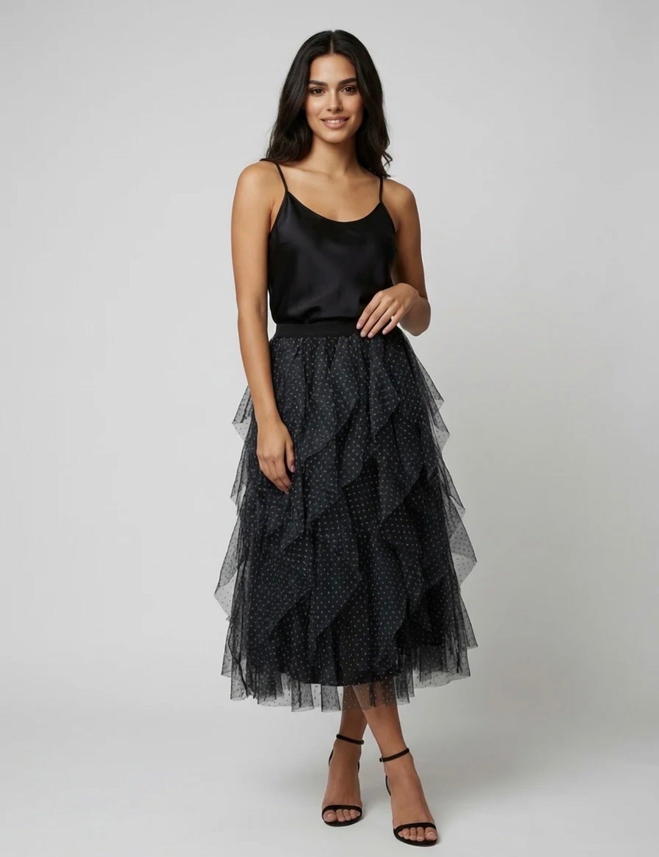 Floaty, feminine, and effortlessly chic, this polka dot tulle skirt is a timeless statement piece for any wardrobe. Crafted from layers of soft, airy tulle, it features delicate tonal polka dots that add subtle texture and charm. The midi length creates a graceful silhouette, while the gentle volume offers beautiful movement with every step.