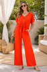 The top showcases a modern V-neckline with delicate button detailing and a stylish front tie that adds a touch of femininity while allowing you to adjust the fit to your liking. Paired with wide-leg trousers featuring a comfortable elastic waistband and practical side pockets, this set is the perfect blend of laid-back luxury and versatility.