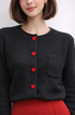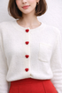 This soft knit cardigan is finished with charming velvet heart-shaped buttons that add a romantic touch to a classic silhouette. Crafted from a cozy, lightweight yarn, it features a round neckline, long sleeves, and a delicate chest pocket for subtle detail. The plush velvet buttons create a beautiful contrast against the knit fabric, making the cardigan both eye-catching and elegant. Perfect worn on its own or layered, this piece blends comfort with feminine charm for everyday wear or special occasions.