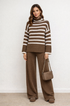 This cozy two-piece knit set features a relaxed, modern silhouette designed for effortless everyday wear. The top is a striped, long-sleeve sweater with a soft turtleneck and dropped shoulders, giving it a laid-back yet polished feel. Paired with matching wide-leg knit trousers, the set delivers a coordinated look that’s both comfortable and chic.