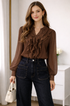 Elevate your everyday elegance with our Romantic Ruffle Blouse, a timeless statement piece designed for the modern woman who loves a touch of femininity. Crafted from a lightweight, semi-sheer fabric, this blouse features cascading ruffles down the front and along the neckline, creating beautiful movement and soft dimension with every step.